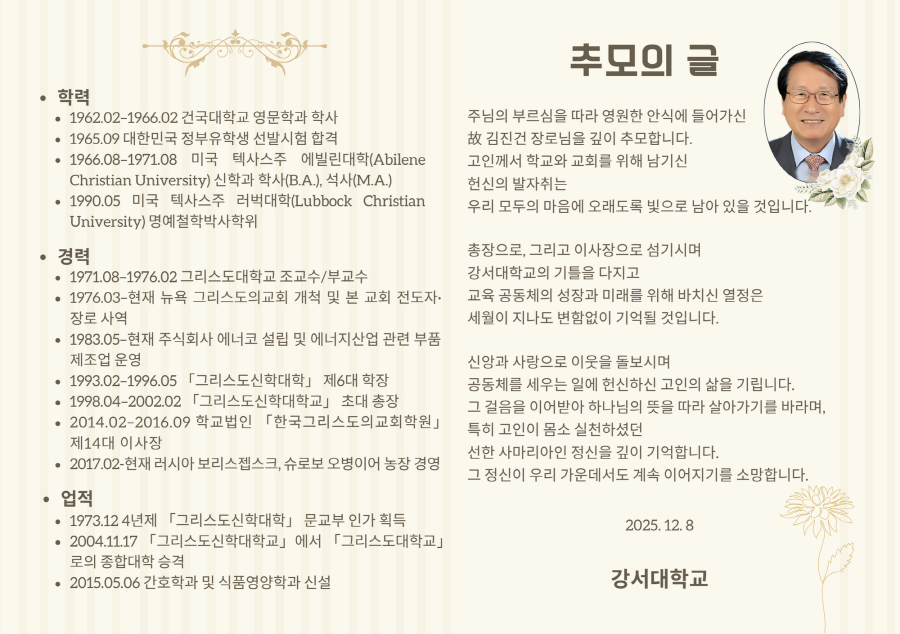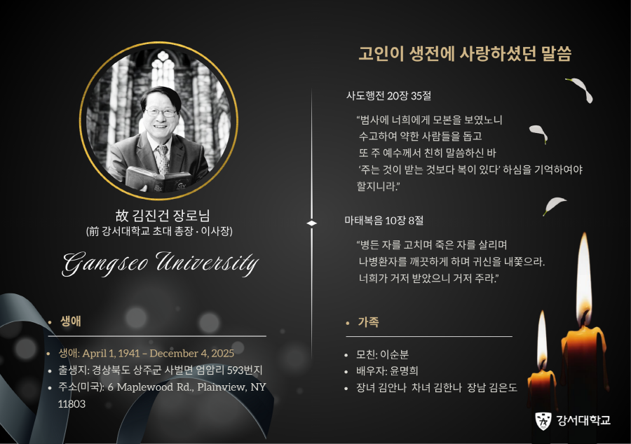 고 김진건 장로님은 강서대학교 초대 총장과 학교법인 이사장을 역임하며, 대학이 종합대학으로 성장하는 데 중요한 역할을 수행했다. 교육기관의 체계와 방향을 정립하는 데 힘쓴 그는 후학들을 위한 기반을 구축하며 대학 발전에 크게 기여한 인물로 평가받고 있다.