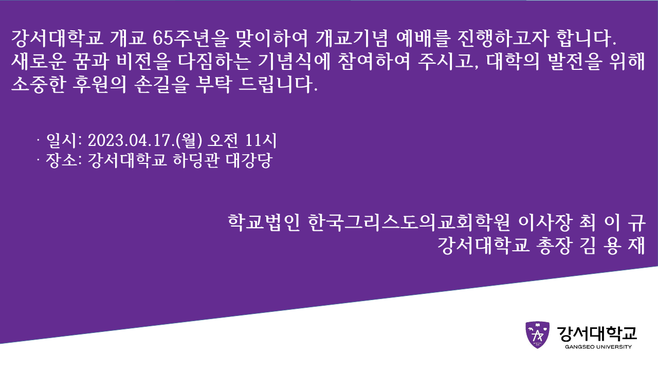 강서대학교 제 65주년 개교 기념 감사예배를 아래와 같이 드립니다. 귀한 발걸음 해 주셔서 자리를 빛내 주시면 감사하겠습니다.