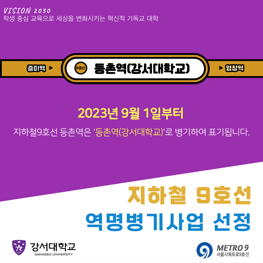 강서대학교의 계약기간은 23년 9월1일부터 3년간이며, 계약만료 후 3년간 연장할 수 있다. 9호선은 평일 기준 하루 472회, 주말 및 공휴일 기준 388회 운행되며, 하루 평균 60만 명이 이용한다. 따라서, 강서대학교 교명은 매일 60만 명의 시민들에게 직, 간접적으로 노출되게 되며, 이는 대학을 알리고 홍보하는데 상당한 효과가 있을 것으로 기대하고 있다. 강서대학교는 등촌역 역사 내 문화공간 구축 사업 또한 논의 중이며, 등촌역을 오가는 시민들에게 휴식 공간 제공 및 추가적인 교명 홍보를 검토하고 있다. |