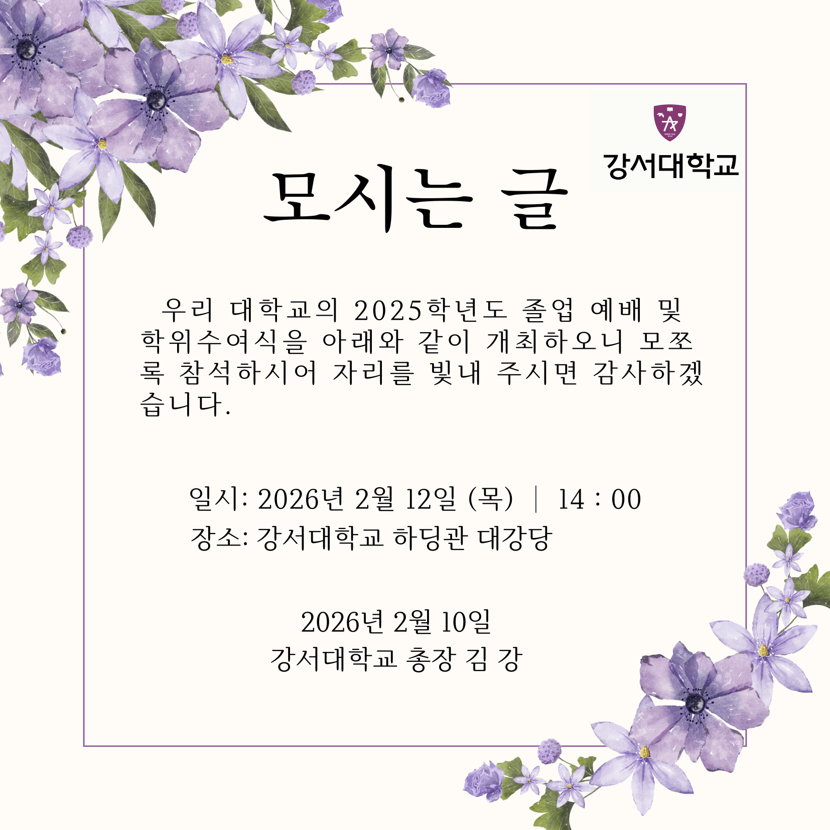 | [강서대학교 학위수여식] | 운영자 | 2026-02-12 | |||